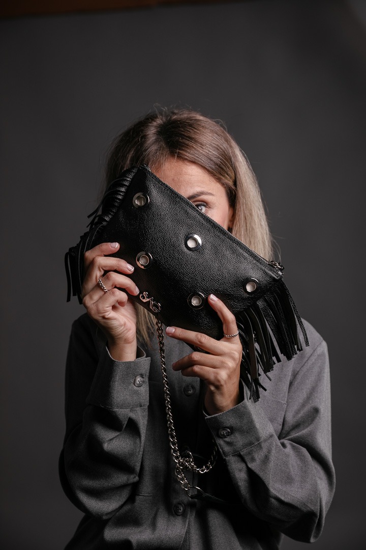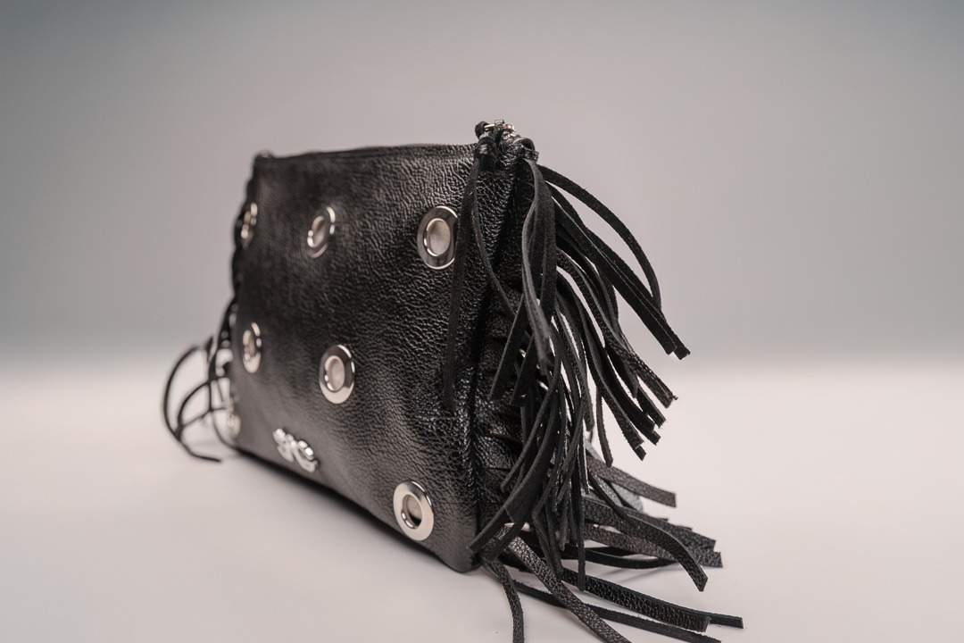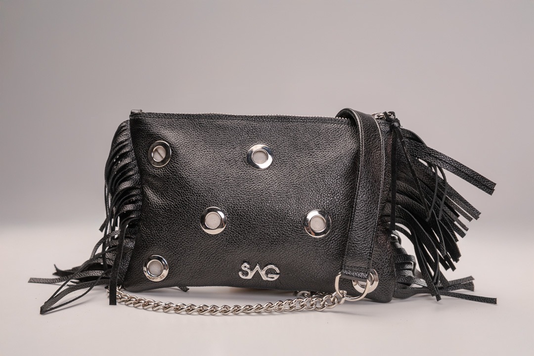 Pouch con cadena, flecos laterales y hoyuelos que dejan ver el forro, detalles en plata. Lujo artesanal con brillo sutil. ❤️