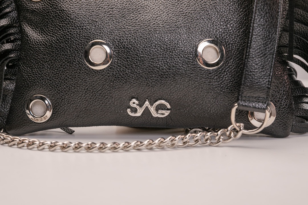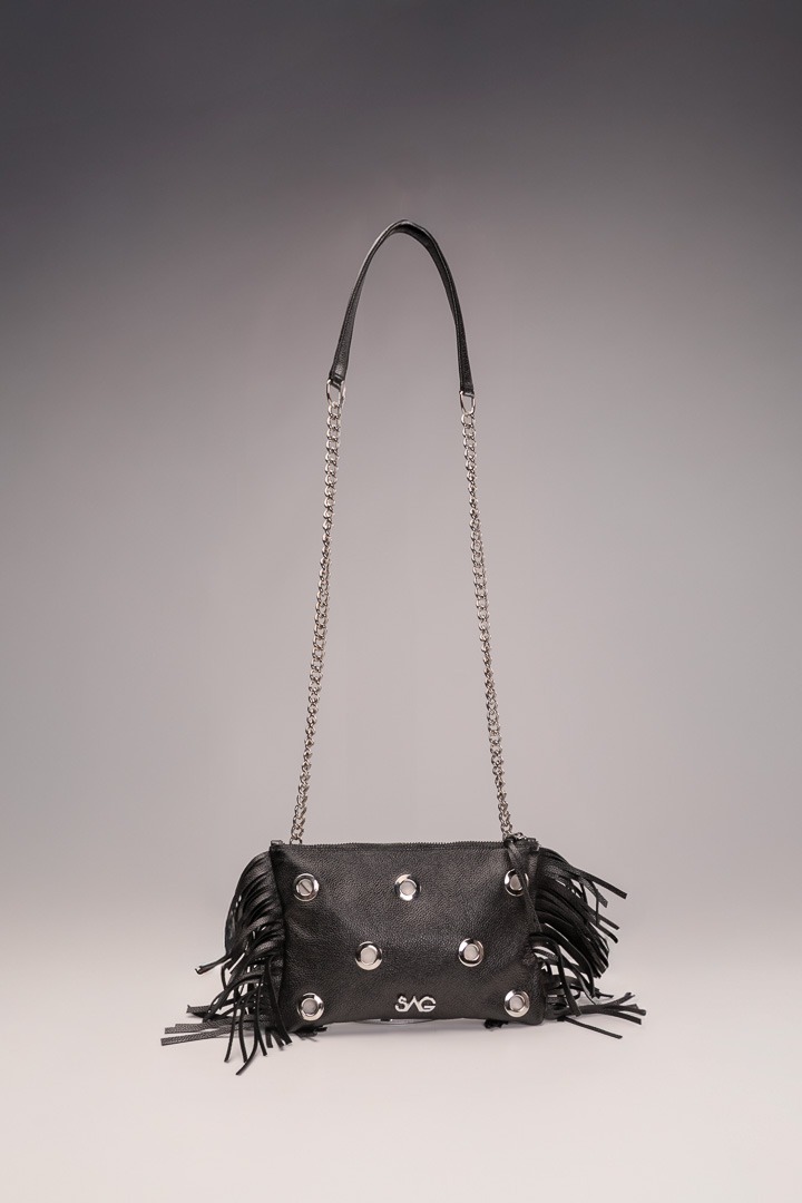Azucena Fringe Negro Brillante está confeccionado en piel batida con ligero brillo, aportando un efecto sofisticado y elegante. Incluye hoyuelos que dejan ver el forro en contraste, flecos laterales y cadena, con detalles metálicos en plata.