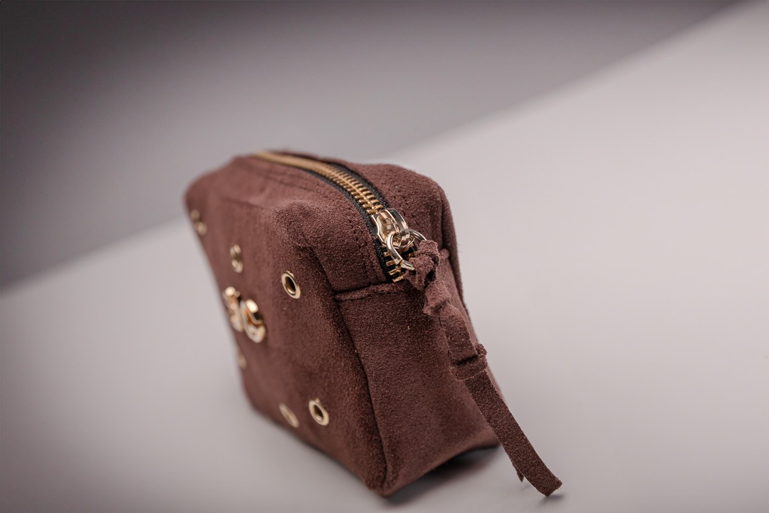 Este monedero Vanessa está confeccionado en piel de serraje color chocolate, un tono cálido y atemporal. Los hoyaos pequeños bañados en oro aportan un contraste luminoso que realza la textura suave del serraje y convierte esta pieza en un accesorio especial.